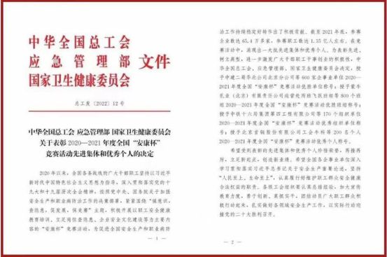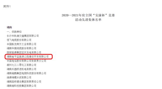日前,中华全国总工会、应急管理部、国家卫生健康委员会印发了《关于表彰2020—2021年度全国“安康杯”竞赛活动先进集体和优秀个人的决定》,平益高速公司荣获2020—2021年度全国“安康杯”竞赛活动优胜单位称号。